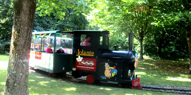 Kindereisenbahn „Jolante“: Rund 300 m Gleis, elektrisch betriebene Lok im Dampflok-Stil, ganzjähriger Betrieb entlang der Teiche .